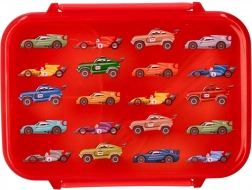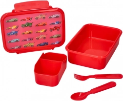 Praktický lunch box s motivem aut je ideální na svačinu do školy, práce i na cesty. Obsahuje vidličku a lžičku, je vhodný do mrazáku a lze jej ohřívat v mikrovlnné troubě bez víčka (max. 100 °C). Kompaktní rozměry usnadňují přenášení a skladování.