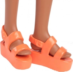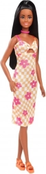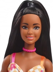 Nádherná vysoká lalka Barbie s dlouhými černými vlasy částečně sepnutými, ozdobená růžovým chokerem a oranžovými platformovými sandály. Její vzhled doplňuje elegantní šaty s květinovým vzorem.