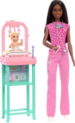 Objevte svět plný kreativního vyprávění a možností kariérních rolí s touto inspirativní Barbie dětskou lékařkou! Tento hrací set zahrnuje Barbie s její pacientkou včetně lékařského prostředí s růžovým a zeleným pečovatelským koutkem.