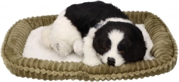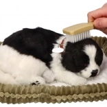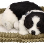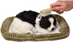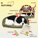 Detailní černo‑bílá srst, obojek s plíškem a jemné „dýchání“ při spánku dodávají štěňátku autentický dojem skutečného mazlíčka.