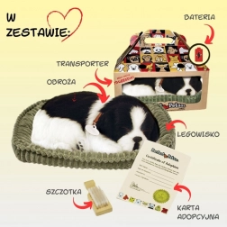 Tento věrně zpracovaný plyšový pejsek vypadá a působí jako opravdové štěně. Jemná černo‑bílá srst, obojek s plíškem a klidný spánek s efektem dýchání vytvářejí uklidňující atmosféru pro odpočinek a usínání. Ideální pro děti, které touží po vlastním mazlíčkovi.