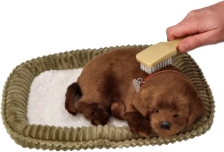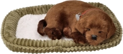 Detailní provedení čokoládového labradora s uzavřenými očima a obojkem na hebkém pelíšku vytváří dojem opravdového spícího štěněte.