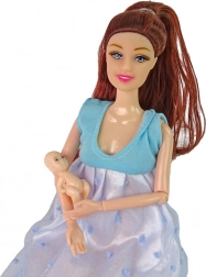 Roztomilá těhotná panenka s otevřitelným bříškem a mini miminkem je skvělá pro kreativní hraní. Má dlouhé hnědé vlasy, nosí elegantní modré šaty s puntíky a pohyblivé končetiny pro realistické pózování. Součástí je vyjímatelné miminko a možnost otočit bříško na ploché. Ideální pro hraní na rodinu a rozvoj fantazie dětí od 3 let.