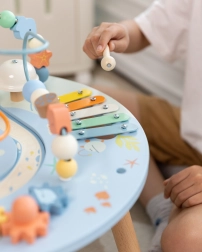 Stolek obsahuje xylofon, zvonky a další hudební prvky, které probouzí zájem o hudbu a rytmus.