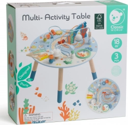 Dřevěný stolek aktivit od značky Classic World je ideální hračkou pro zvídavé děti! Plný barevných atrakcí, jako jsou pětice motorických aktivit, ozubená kola, xylofon nebo bubínek, přináší mnoho radosti a současně pomáhá rozvíjet důležité dovednosti, jako je manuální zručnost, logické myšlení a obratnost.