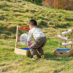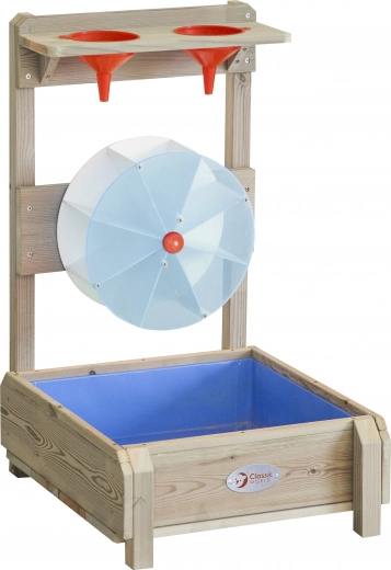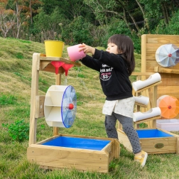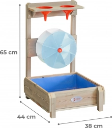 Tato venkovní vodní hračka z impregnovaného přírodního dřeva je ideálním doplňkem každé pískoviště i zahrady. Děti se naučí principy proudu vody a příčiny–následku, zatímco roztočené kolo a průtok žlábky přinášejí radost z objevování.
