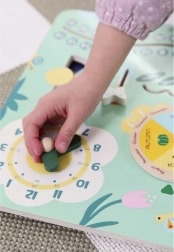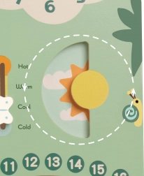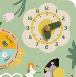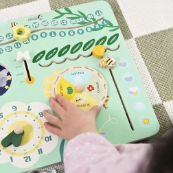 Dřevěný kalendář poskytuje děti možnost samostatně nastavovat datum, měsíc a roční období, což pomáhá rozvíjet jejich motorické dovednosti.