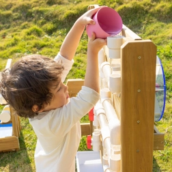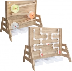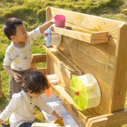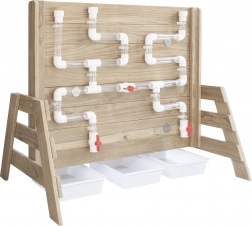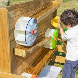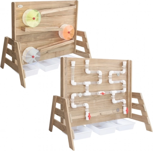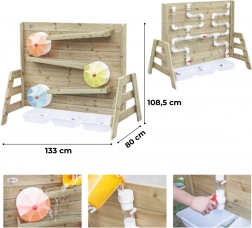 Dřevěná konstrukce z impregnovaného dřeva odolává povětrnosti a je ošetřena netoxickým nátěrem. Výborně doplní pískoviště i venkovní dětské hřiště – poskytuje nekončící zábavu a zároveň bezpečné prostředí pro experimenty s tokem vody a uváděním kola do pohybu.
