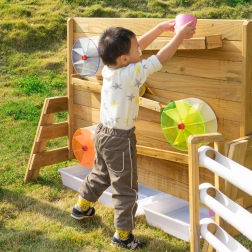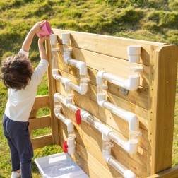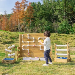 Tato oboustranná stěna kombinuje smyslovou vodní hru se STEM učením. Jedna strana nabízí barevná vodní kola a žlábky pro pozorování toku vody a příčin-následků, druhá strana přináší síť průhledných a bílých trubek s ventily pro řízení průtoku. Děti si trénují jemnou motoriku, logické myšlení a spolupráci.