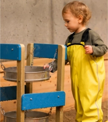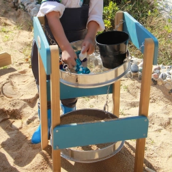 Dvojité síto CLASSIC WORLD EDU je promyšlená stanice pro smyslovou (sensory) hru, která podporuje učení formou experimentu. Dvě kovová síta s velkou plochou jsou zavěšena na řetízcích, takže děti mohou sledovat proces prosívání, porovnávat materiály a zkoušet různé rychlosti sypání či polévání vodou. Díky pevné dřevěné konstrukci je set vhodný pro každodenní provoz v mateřských školách i na veřejných hřištích.