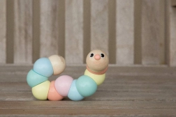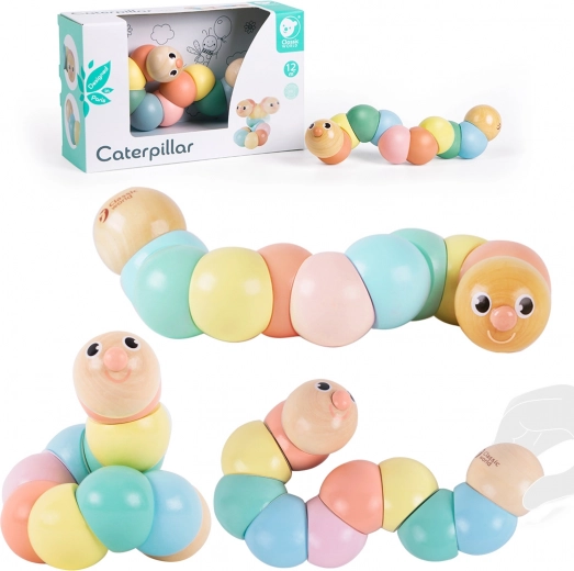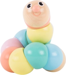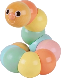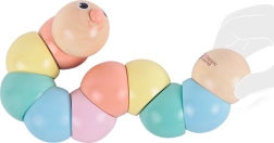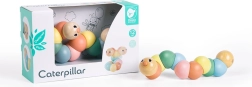 Dřevěná housenka je ideální první motorická hračka: příjemně padne do dětské ručky, hladce se ohýbá a natáčí a motivuje k objevování tvarů a pohybu. Pastelové barvy podněcují zrakové vnímání a přátelský obličej housenky láká ke hře znovu a znovu.