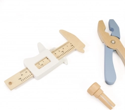 Součástí jsou kladívko, šroubovák, klíč, pilka, kleště a funkční měrky – ideální pro nácvik jemné motoriky a koordinace.