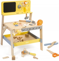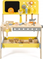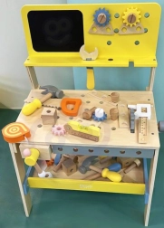 Dřevěný pracovní ponk je ideální hračkou pro malé kutily. Děti mohou šroubovat, zatloukat, měřit a skládat ozubená kola, zatímco si rozvíjejí manuální dovednosti a logické myšlení. Integrovaná křídová tabule je skvělá pro náčrty a nápady na další projekty.