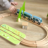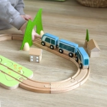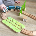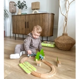 Díly lze kreativně kombinovat – dřevěné bloky se dají stavět na sebe a vytvářet domečky kolem kolejí. Kvalitní přírodní materiály (dřevo s certifikací FSC, filc z recyklovaného P.E.T.) jsou odolné, příjemné na dotek a šetrné k přírodě. Ideální pro samostatnou hru i společné objevování.