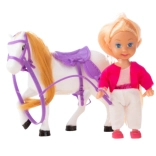Obsah balení: mini panenka v jezdeckém oblečku, bílý kůň s dlouhou hřívou a ocasem, fialové sedlo a uzda, jezdecký bičík.