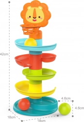 Tato barevná spirálová věž pomáhá rozvíjet motorické dovednosti, koordinaci a přesnost vašich dětí. Pět úrovní zaručuje dlouhodobou zábavu, zatímco sympatický lev na vrcholu může inspirovat děti k cílům a zlepšení jejich schopností. Míčky obsahují drobné elementy vydávající zvuky a nabízející dodatkové smyslové podněty. Hračka je vyrobena z bezpečného a testovaného plastu pro maximální bezpečnost malých hráčů.