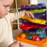 Děti mohou kuličky shazovat kladívkem, sledovat jejich jízdu po drahách a spouštět autíčko po samostatné zjezdové rampě. Jedna hračka, mnoho způsobů hraní.