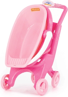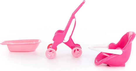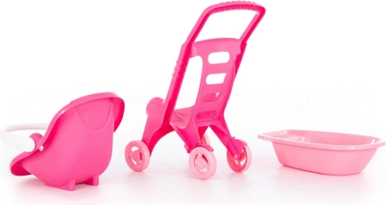 Součástí je kočárek pro panenky, autosedačka/baby nosítko a malá vanička – vše sladěné do výrazné růžové barvy. Sada je ideální pro hraní rolí, učení péče o miminko a zábavu doma i venku.