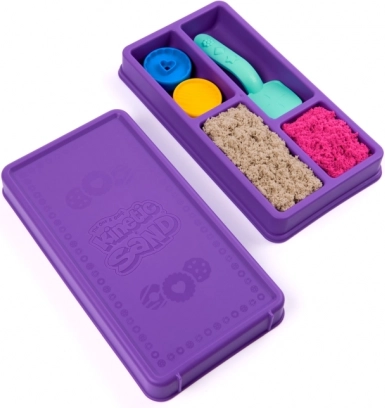 Robustní fialové pouzdro slouží jako herní stanice i úložný box. Vnitřní přihrádky udrží písek a nástroje oddělené a připravené na další pečení „sušenek“. Vezmete ho pohodlně kamkoli.