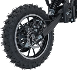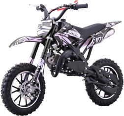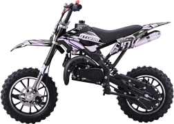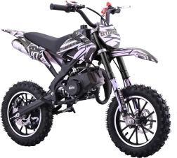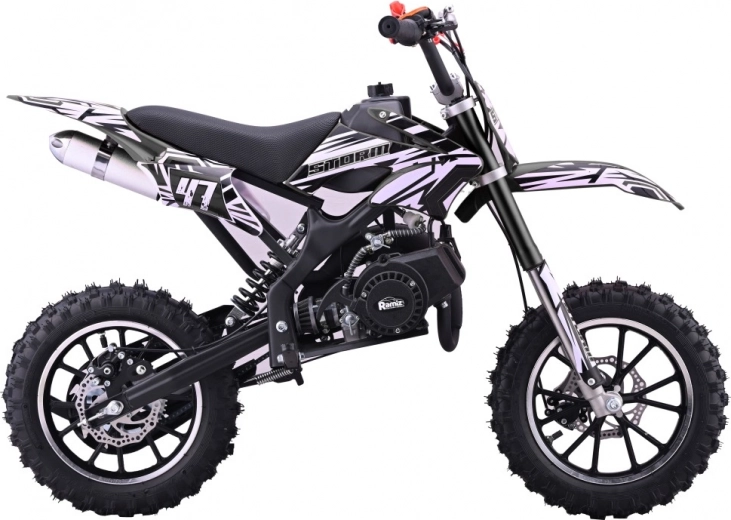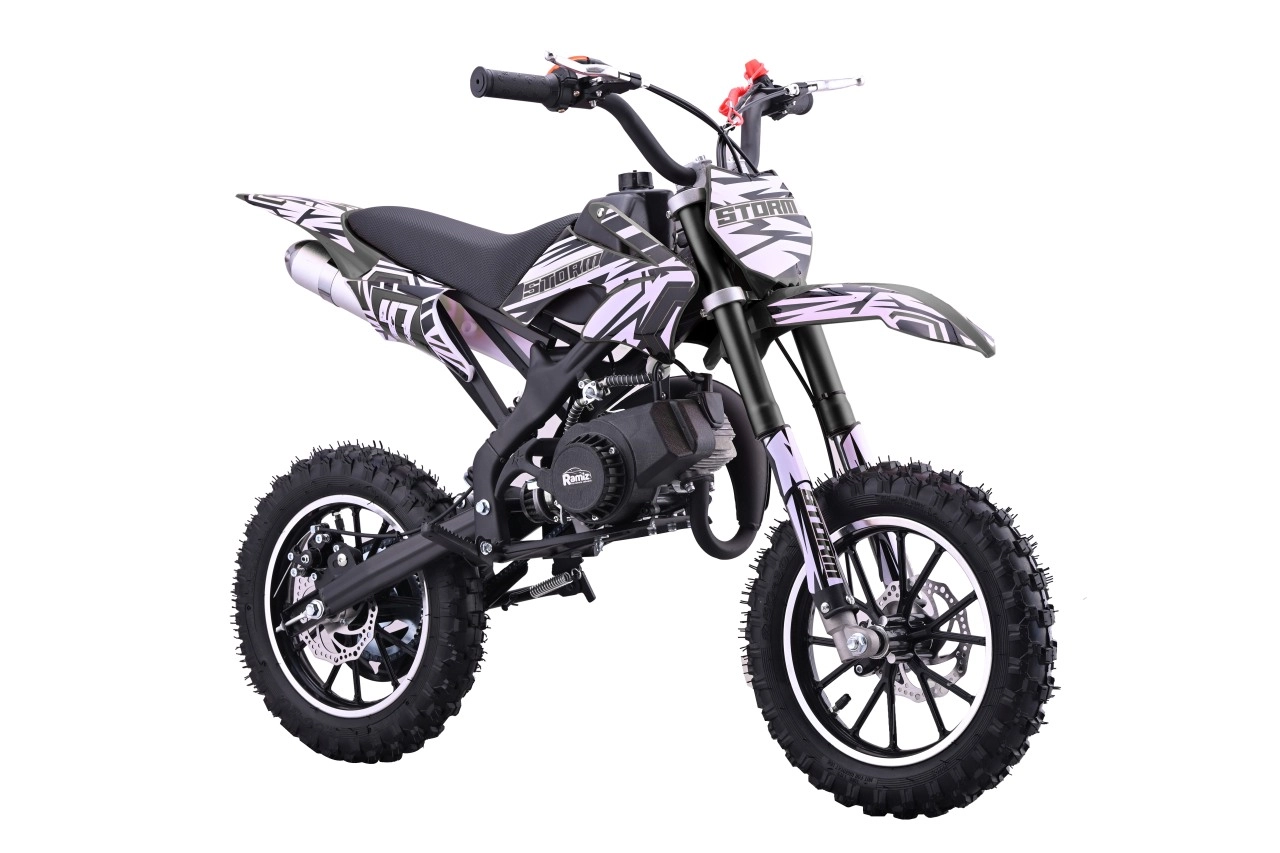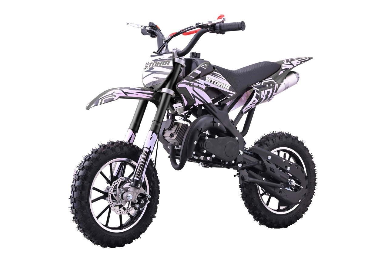 Mini dirt bike STORM je skvělá volba pro první krůčky v off-road světě. Lehká a obratná konstrukce s práškově lakovaným rámem zvládne nerovnosti a poskytne jistotu v zatáčkách. Dvoutaktní, vzduchem chlazený jednoválec 49 cm³ se startuje ručním startérem a zajišťuje svižnou akceleraci pro jízdu po loukách i lesních cestách.