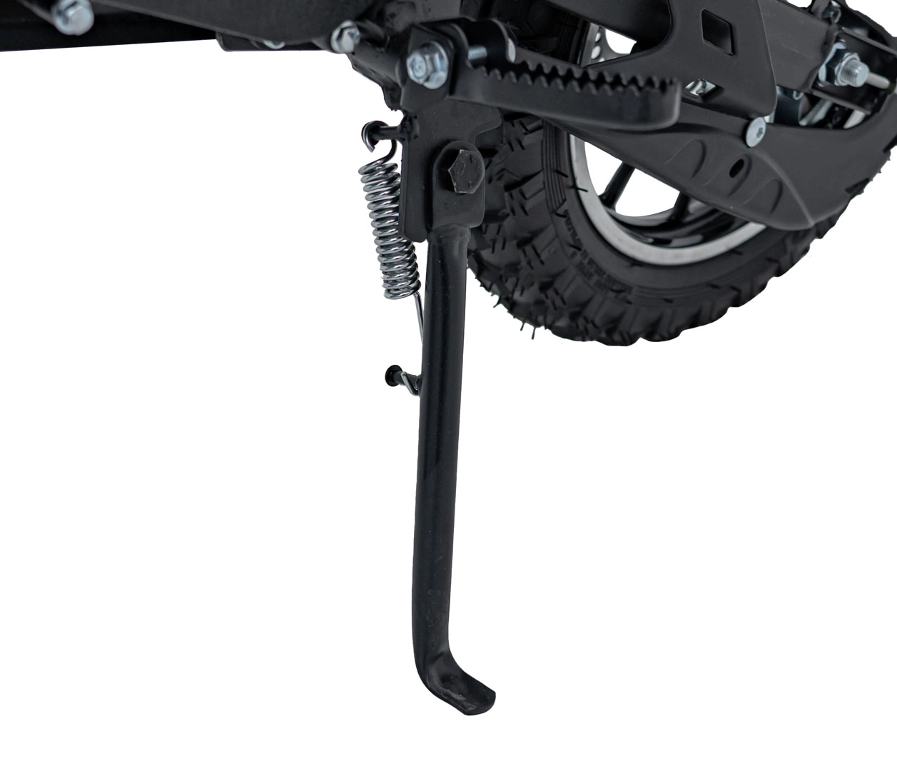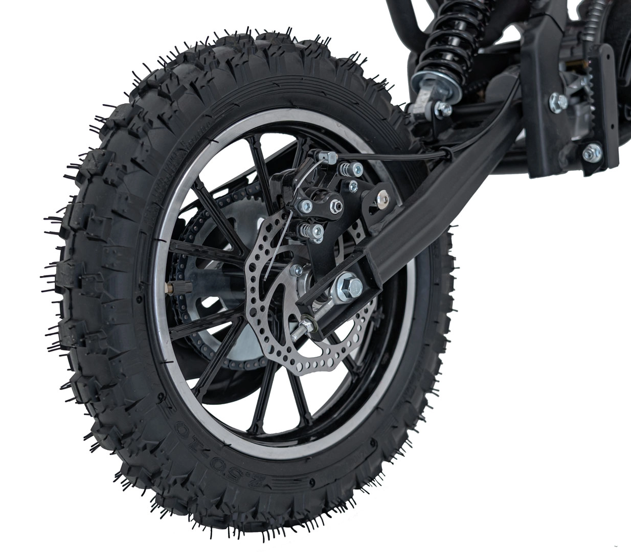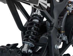 O bezpečné zastavení se starají kotoučové brzdy na obou kolech, komfort zvyšuje přední teleskop a zadní tlumič. Široké, hrubě vzorkované pneumatiky 2.5-10 poskytují výbornou trakci. Praktické detaily jako kuželový vzduchový filtr, štítek s výrobním číslem a voděodolné, měkké sedlo podtrhují dlouhou životnost a pohodlí.