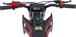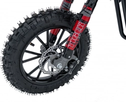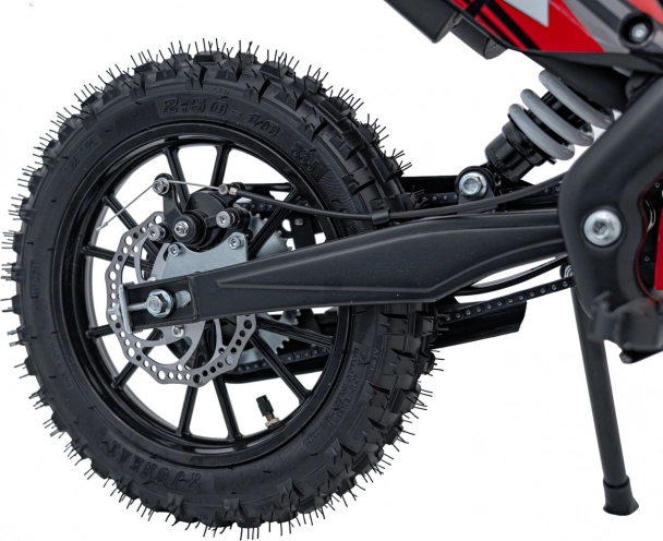 O bezpečné zastavení se starají kotoučové brzdy na obou kolech. Terénní pneumatiky 2,5-10 s hrubým vzorkem přinášejí trakci na hlíně i štěrku, zatímco přední teleskopická vidlice a zadní nastavitelný tlumič tlumí nerovnosti. Komfort doplňuje měkké, voděodolné sedlo a praktická kill switch šňůra, která při vytržení okamžitě vypne motor.