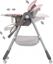 Až 7 výškových pozic sedáku, 4 polohy zádové opěrky a 2 polohy opěrky nohou zajistí pohodlí při jídle i odpočinku. Sedák z ECO kůže je měkký a snadno omyvatelný.