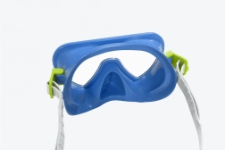 Modrá potápěčská maska je vybavena UV ochrannými čočkami a nastavitelným silikonovým páskem, který zajišťuje pohodlí a bezpečnost pod vodou.