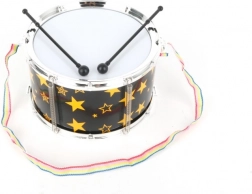 Žlutý bubínek s černými hvězdami a multibarevným popruhem je vizuálně atraktivní pro děti.