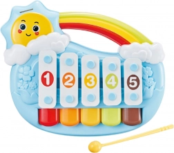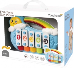 Roztomilé pianinko ve tvaru usměvavého sluníčka nabízí 5 tónů, které děti snadno rozezní lehkým poklepem. Od 6 měsíců podporuje rozvoj smyslů, jemné motoriky a vnímání rytmu. Součástí jsou 3 listy s melodiemi, barevné provedení přitahuje pozornost a bezpečné zpracování s zaoblenými hranami je ideální pro nejmenší. Praktické úchopové madlo usnadňuje přenášení doma i na cestách.