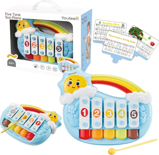 Objevte první hudební krůčky vašeho děťátka s pianinkem ve tvaru sluníčka. Mechanické vytváření tónů bez baterií je intuitivní a bezpečné – stačí jemně ťuknout do kláves. Kontrastní barvy zaujmou, přiložené notové kartičky usnadní učení jednoduchých melodií a rozvíjejí cit pro rytmus.