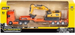 Model nákladního auta s nízkopodlažním návěsem a bagrem je přesnou replikou přepravního vozidla určeného k přepravě těžké stavební techniky. Vyroben z kvalitního kovu a odolného ABS plastu, tento model kombinuje pevnou konstrukci, trvanlivost a preciznost.