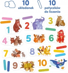 Hra s puzzle podporuje rozvoj slovní zásoby, fantazii a vizuální vnímání. Děti mohou zvířátka pojmenovávat, vymýšlet příběhy a hledat čísla ve svém okolí. Set je skvělým startem pro učení počítání do 10 a první pokusy o psaní číslic.