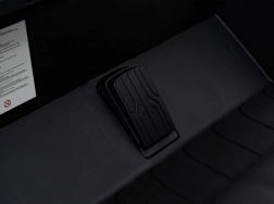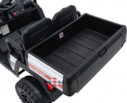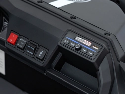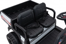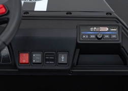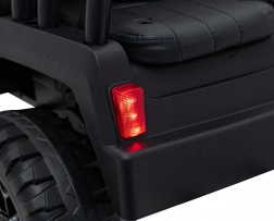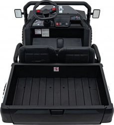 Interiér potěší dvěma samostatnými sedadly z eko kůže s bezpečnostními pásy, funkčním audio panelem (FM rádio, MP3, Bluetooth, USB) i ovládacími prvky na volantu. Pro větší bezpečí rodičů je k dispozici dálkový ovladač 2,4 GHz se třemi rychlostmi a okamžitým tlačítkem STOP. Velký zadní kufr s výklopným čelem odveze vše potřebné na vaše výpravy.