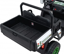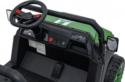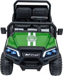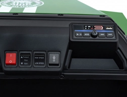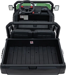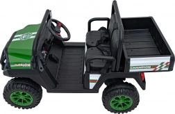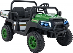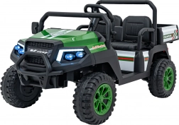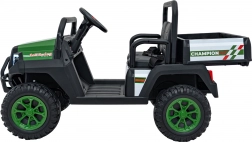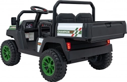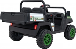 Pick-up CHAMPION v zelené barvě je ideální volbou pro malé dobrodruhy. Díky silným motorům 2×200 W a baterii 24 V 9 Ah nabízí plynulou jízdu, pomalejší rozjezd pro bezpečí a dvě rychlosti vpřed i zpět. Velká EVA kola 29×12 cm, přední i zadní odpružení a vysoký světlý podvozek 19 cm zajišťují komfort i mimo chodník.