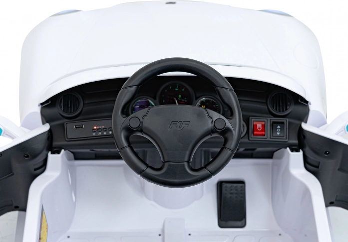 Multimediální panel s MP3, USB a Bluetooth přinese oblíbené písničky přímo do kokpitu. Na volantu jsou tlačítka zvuků a klaksonu, nechybí indikátor stavu baterie. Reálný zážitek doplňují otevírací dveře, sportovní detaily karoserie a LED osvětlení s vypínačem.