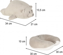 Tento praktický cestovní polštář 2v1 je ideální pro děti i dospělé, kteří hledají pohodlí a pohodlí při cestování. Polštář se snadno přemění na plyšového medvídka, s kterým je radost se mazlit. Nabízí skvělou oporu pro krk a hlavu díky ergonomickému tvaru a lehkému výplni z kuliček z polystyrenu.