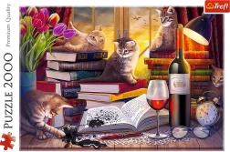 Užijte si relax s kvalitními puzzle Trefl. Motiv Kočičí večer s roztomilými koťaty mezi knihami nabízí 2000 dílků a po složení vytvoří obraz o rozměrech 96,1 × 68,2 cm. Vyrobeno v Polsku z vysoce kvalitních materiálů a se speciálním kalandrovaným papírem pro snazší skládání a menší odlesky.