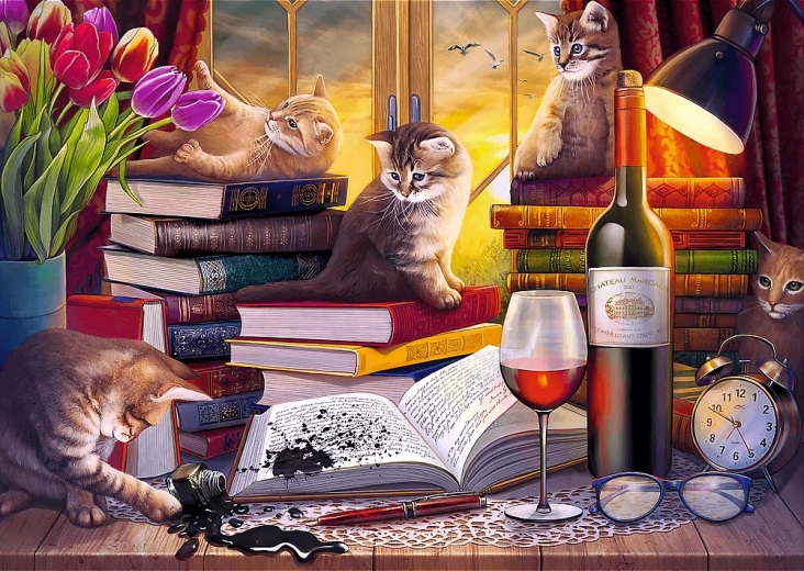 Objevte elegantní motiv plný detailů – hravá koťata v knihovně, který potěší milovníky zvířat i náročné puzzlisty. Díky 2000 dílkům si užijete dlouhé hodiny zábavy, rozvoje trpělivosti a soustředění. Povrch s kalandrovaným, světlo odrážejícím papírem zlepšuje čitelnost motivu a pohodlnější skládání.