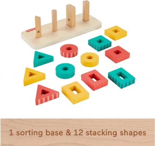 Dřevěný sorter tvarů FISHER-PRICE je bezpečná a odolná vzdělávací hračka inspirovaná principy Montessori. Děti třídí a navlékají pestrobarevné trojúhelníky, kolečka, obdélníky a čtverce na připravenou základnu, čímž si přirozeně procvičují koordinaci oko–ruka, soustředění a vnímání barev a tvarů.