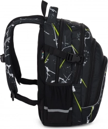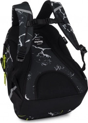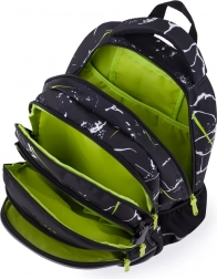 Elegantní vzhled batohu s bílými abstraktními vzory a zelenými detaily zaujme každého školáka.