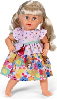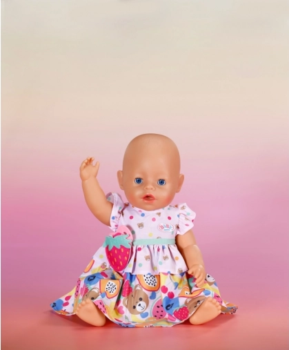 Barevné šaty BABY born s ovocným potiskem pro panenky 43 cm. Volánky, pásek s jahůdkou a ramínko z recyklovaného materiálu. Hravé a kvalitní.