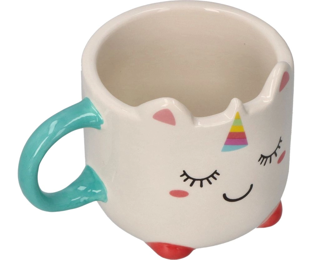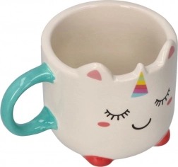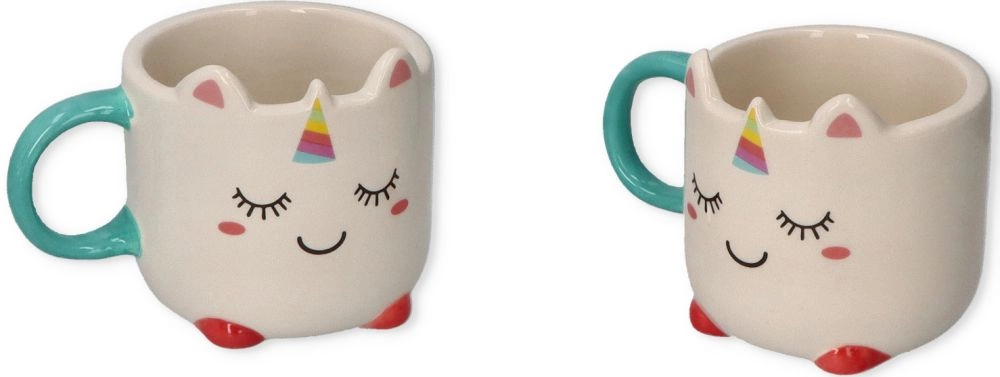 Bílé keramické šálky s duhovým rohem, růžovými tvářičkami a jemnými detaily rozzáří každý kávový okamžik.
