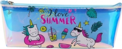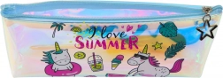 Penál obsahuje holografické motivy jednorožců a letní příslušenství s textem 'I love SUMMER'.