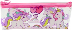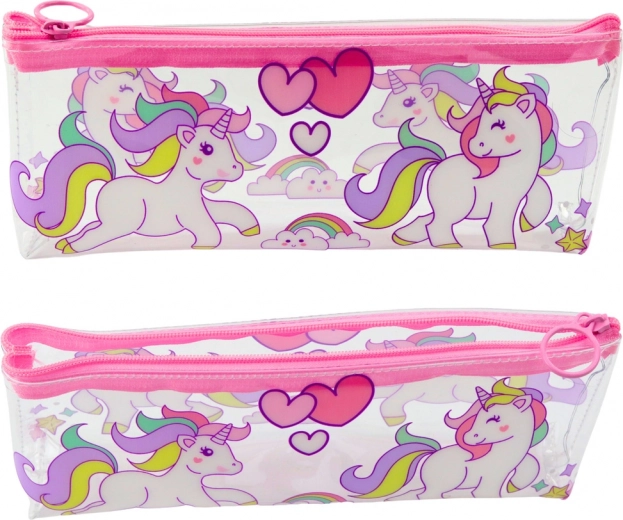 Tento divčí průhledný penál s jednorožci je ideálním doplňkem pro školní výbavu každé malé princezny. Díky průhledné konstrukci s barevnými jednorožci, srdíčky a duhou přitahuje pozornost a rozjasňuje každý školní den.
