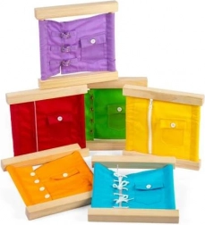 Tato vzdělávací sada v pestrých barvách je inspirovaná metodou Montessori a vede děti k samostatnosti. Zábavnou formou procvičuje koordinaci oko–ruka, posiluje trpělivost, soustředění a schopnost řešit problémy. Každý rámeček simuluje skutečné situace při oblékání.