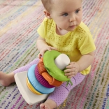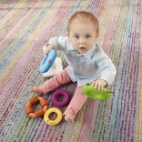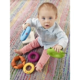 Každý kroužek přináší jiné podněty: stužky, měkký materiál, výrazné drážky, různorodé textury a chrastící korálky. Děti si užijí chytání, mačkání i třesení.
