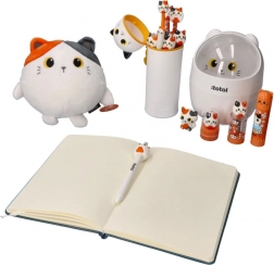 Bílé tělo s černými a oranžovými oušky a veselým kočičím obličejem zaujme na první pohled a dodá školním potřebám osobitý styl.