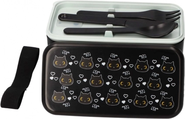 Elegantní černý lunch box s kočičím motivem je ideální pro práci, školu i výlety. Dvě úrovně pro oddělené porce udrží jídlo přehledné a svěží, zatímco pevné víčko a elastický pásek zajistí bezpečné přenášení bez nežádoucího otevření.
