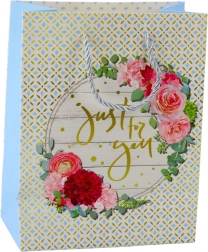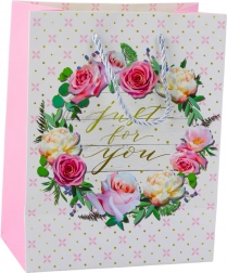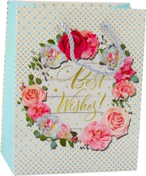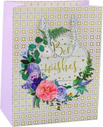Dárková taška s romantickým květinovým vzorem a zlatým nápisem "Best Wishes" pro výjimečné příležitosti.